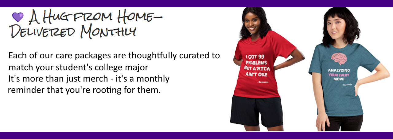 Each month, they’ll receive a major-specific T-shirt curated just for students. Every delivery reminds them they’re not alone—and that someone’s cheering them on from home.